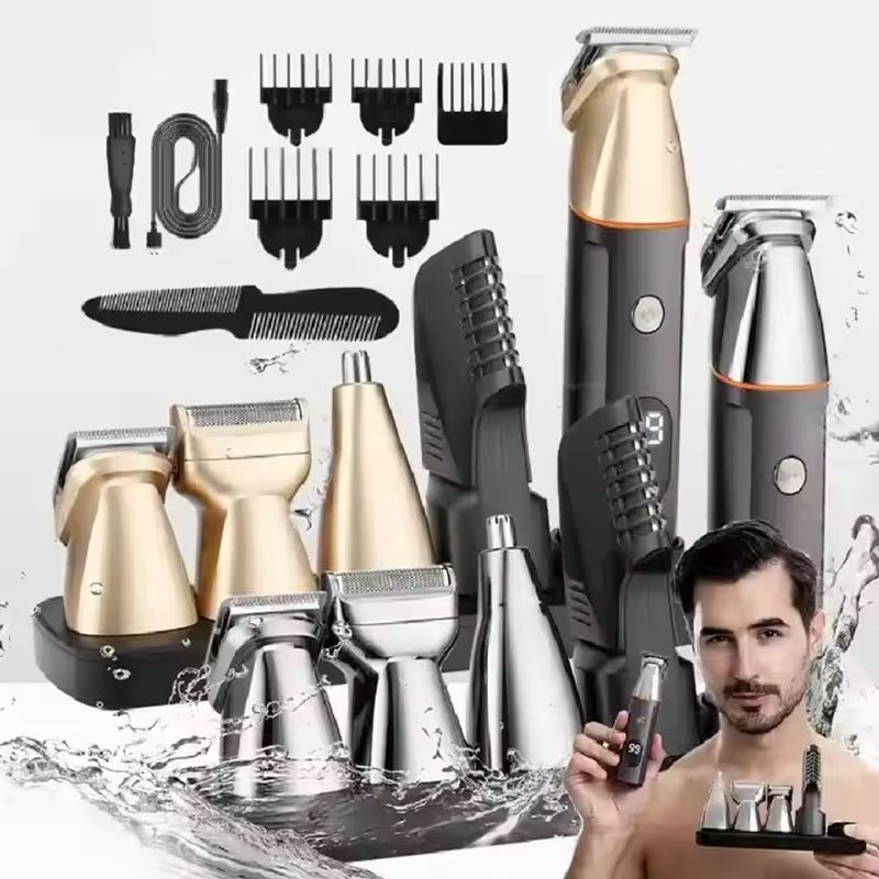 Kit multifuncional doméstico de cuidado pessoal, que oferece serviços de corte de cabelo, barbeamento, corte de cabelos do nariz, corte de cabelos corporais e mais um serviço adicional, totalizando um kit de 5 em 1. Carregamento via USB. Com uma carga completa, pode ser usado por 90 minutos. Facil de limpar, pode ser lavado com água corrente