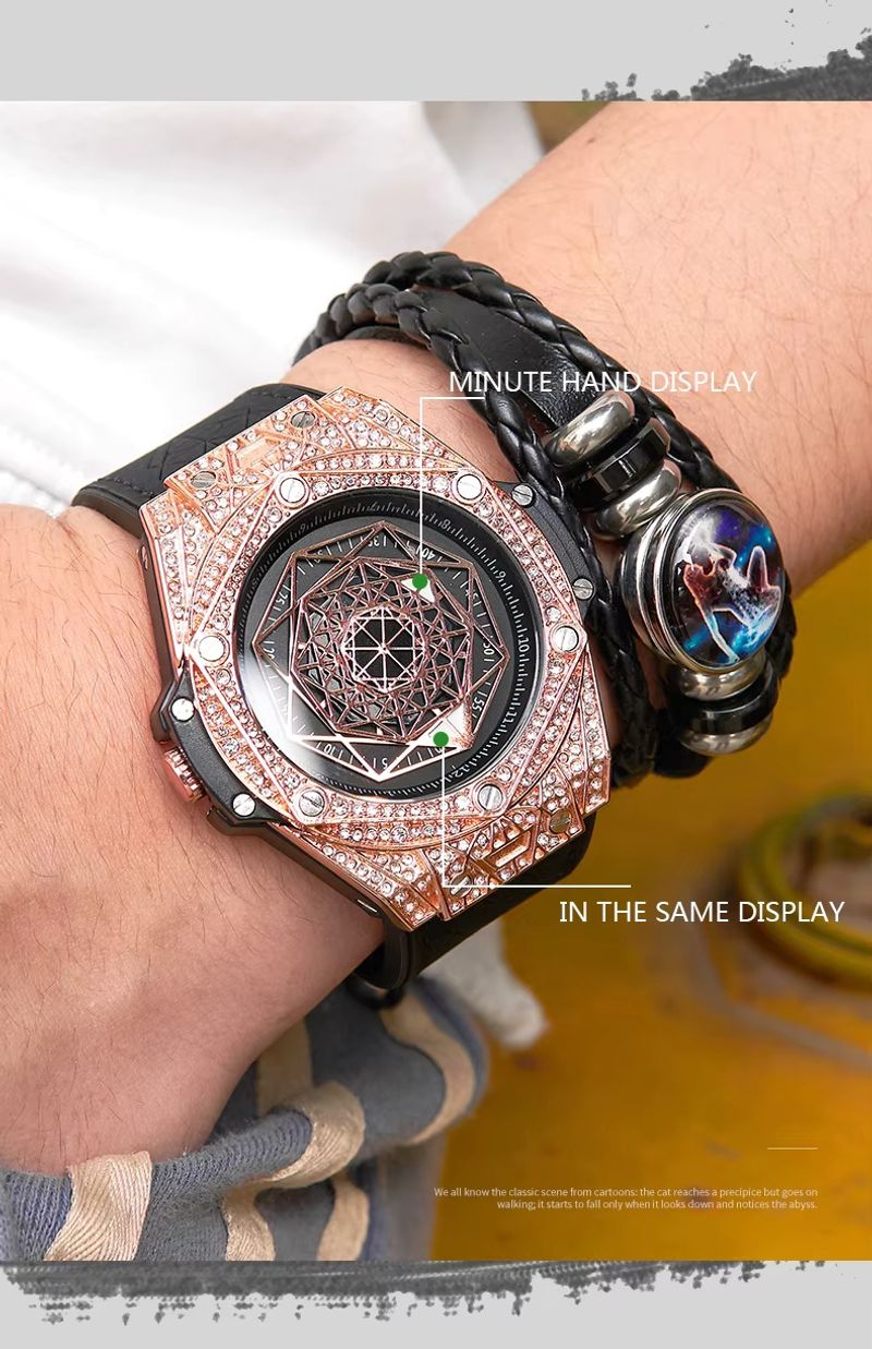 Relógio masculino de quartzo com design incrível de pedras preciosas incrustadas. Seu quadro único exibe um gosto diferenciado. Resistente a arranhões e à água, com ponteiros fosforescentes, é moda, tendência e personalidade. Ideal para esportistas e profissionais de negócios.